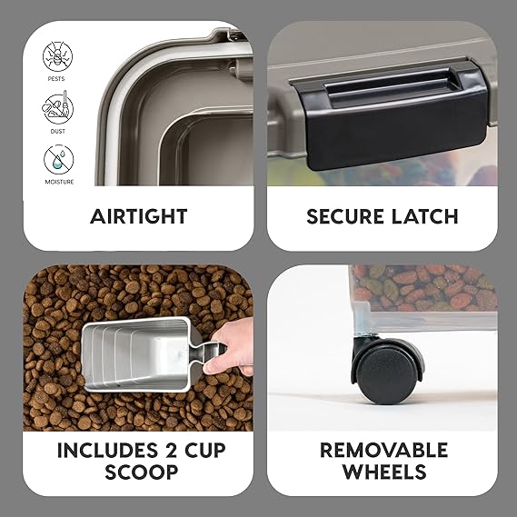 AIRTIGHT CONTAINER: Ensure your pet's food stays fresh with airtight seals and snap-lock latches, keeping moisture and humidity out. Lock in the freshness of dry food and treats while maintaining a neat and organized food storage area. CONTENTS: 14 lb storage container securely stacks on the 40 lb storage container, along with one matching 2-cup scoop and one set of wheels (capacity varies based on the type of food). The scoop makes measuring food easy, and casters allow for mobility. CLEAR CONTAINER BODY: The translucent body allows you to check the food level in just one glance. Quickly check the remaining amount before you head to the pet store DIFFERENT COLORS: Check out the different color containers to store your cute friend's kibbles, pellets, seeds, and treats DIMENSIONS: 18.5"L x 11.5"W x 28.19"H (without casters, 26.63"H)