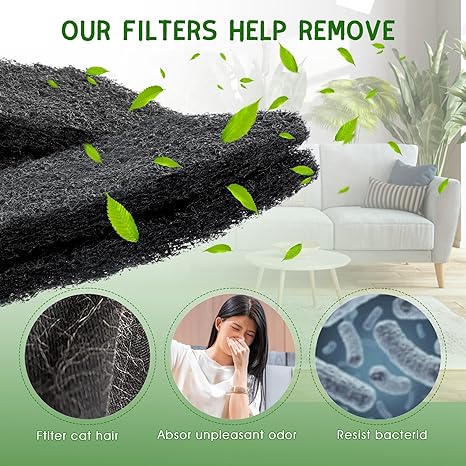 Activated carbon 【Compatible Models】This activated carbon filter are compatible with model 4 and for model 4 connect, which can reduce better odor and get fresher air. 【Pet-Friendly Material】Our filter replacement for cat litter box adopts fiber activated carbon with millions of tiny pores, which increases high absorption and makes the filtration performance more powerful. In addition, this carbon pre filter is non-toxic and tasteless, environmentally friendly, and safe for pets. 【Reduce Odors at Home】This cat litter box filters are aimed at controlling the odor of the litter drawer, reducing the impact of unpleasant water from pets on the air, neutralizing odors in the home and maximizing a fresh home atmosphere. Activated carbon charcoal pads trap urine and feces odors in their pores so your home smells clean and fresh. 【Easy to Use】You just need to remove the old filter sponge and replace it with the new charcoal litter box filters to finish the installation, which only takes a few minutes without any additional tools and knowledge. 【8 Pcs for 8 mth】We offer 8 carbon filters fit for model 4 and can replace according to your cat's usage patterns. However, in order to best control the odor, it is recommended to replace it once a month, so that your litter box filter system will last about 8 months.