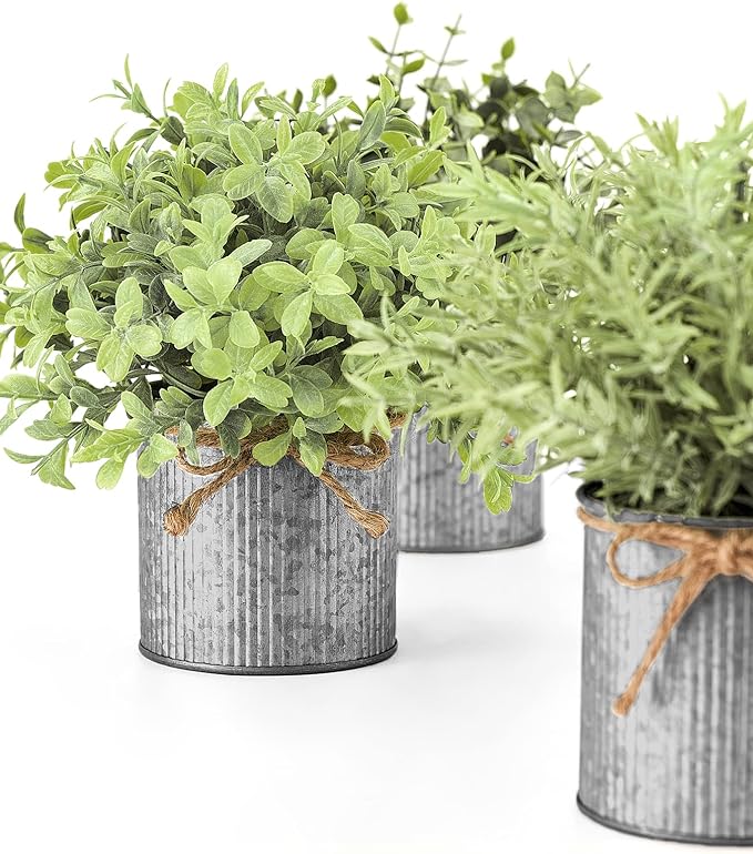 No Need to Assemble : Mini pots with 3 different fake plants in eucalyptus, boxwood, and rosemary, come already set in its own galvanized metal pot for easy displaying. A great way to add modern decorative touch and some natural greenery to your living space. Material : Made of high quality plastic, the artificial plant looks realistic to the eye and remains just as fresh-looking year after year. The pots are made of premium galvanized metal and tied with a jute rope bowknot, adds rustic and country sense for household style. Rustic Farmhouse Home Decor : Lightweight Faux potted plants can be a vintage elegant addition to coffee table, centerpieces, shelves, counter, cabinets, kitchen, bathroom, laundry room, mudroom, bedroom, living room, classroom, or any other place you want to add vitality. Easy to Care : No need for much maintenance or care the plastic plants, they will neither wither nor fade. Just wipe it gently with a damp cloth occasionally.The dust on the surface is artificial plant‘s fuzz design, making the plant look more realistic, please don't worry about it! Dimensions : Each artificial potted plant measures appr. 7.5" tall x 3" wide. Perfect Gift for who wants to easily enjoy the beauty of nature! Mkono is a registered trademark and our product is professional manufacturing and sole selling.
