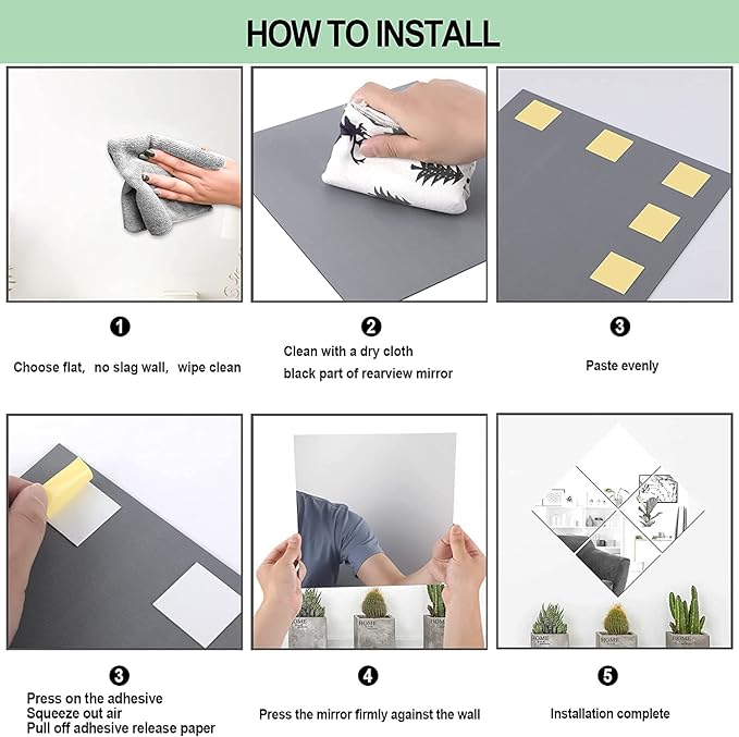 【Acrylic Material】The self adhesive squares mirror tiles is made of acrylic material that has a smooth surface and a good texture,Which is safer and can avoid scratches,its shatterproof and bendable;Each adhesive mirror sticker is attached with a protective film on the front side,tearing off the film can show the reflection of the mirror. 【2MM Thickness】The thickness of our body mirror is 2MM. Compared to normal mirrors with a thickness of 1mm, our mirror looks clearer, more structured and more realistic.Wall mirror edges is delicate frosted,Our mirror safe for child and pets. 【Reflective Effect】Our acrylic mirror tiles with reflective effect can be applied for nice decorations; Reflective surfaces can make the space look larger and brighter;Please use mirror paste on a smooth surface, the flatter the wall, the better the reflection. 【Wide Application】The wall mirror decor can be used as an interior decoration, making the interior space more spacious, suitable for bedrooms, living rooms, bathrooms, dressing rooms, closet,kitchens,wardrobe,hallway, etc.You can use decorative mirror for workout mirror,gym mirrors,make up mirror,over the door mirrors long wall mounted. 【What You Will Get】18 piece stick on mirror, 8inch x 8inch / 20x20cm (thickness: approx. 2mm), as well as a double sided foam tape. Easily installed on smooth walls.You can use your imagination to arranging mirror sheets into any shape to decorate the home walls.