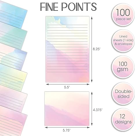 100-PIECE SET - 5.5" x 8.25" double-side printed, one-side lined watercolor-style stationery printed in 12 unique designs with matching envelopes; 50 sheets & 50 envelopes QUALITY - Double-sided 27 lb. bond/100 gsm paper and 32 lb. offset envelopes with designs that resemble billowy abstract watercolor art; paper will accommodate ballpoint pen, markers, and more PEN PAL-FRIENDLY - Send your handwritten correspondence on this gorgeous stationery to friends and family GREAT DESIGNS - 4 or 5 sheets & envelopes of each unique design, 12 designs in all STYLISH - The perfect canvas for creating beautiful letters and invitations