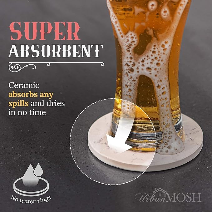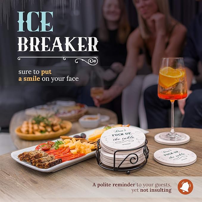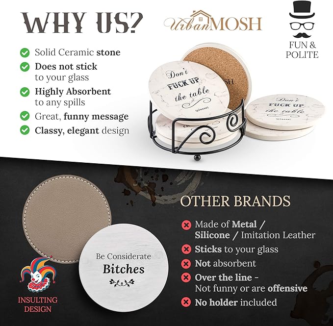 ☑️ Novelty Coasters For Drinks – Sure to put a smile on your face, these absorbent coasters will hilariously remind people to keep their drinks off the table. ☑️ Does Not Stick to Your Glass – The white marble style ceramic top on these cute coasters help capture moisture from ice cold drinks and protect surfaces from hot coffee cups. More absorbent than sandstone coasters. ☑️ Memorable Housewarming Gift Idea – These unique coasters can be given as birthday, holiday, Christmas, dirty Santa, or valentines day gifts to men, women, and friends. ☑️ Slip-Resistant Cork Backing – Each 6-piece set of our funny drink coasters features a durable cork back to help protect furniture or tabletops from scratches or scuffs. ☑️ Metal Holder Included – Great for your home, kitchen, living room, man cave, bar, end tables, or college dorm room, enjoy a laugh and your favorite drink.