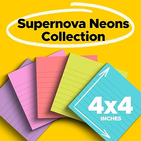 EXPERIENCE THE POWER OF 2X STICKINESS: Post-it Super Sticky Notes offer twice the sticking power of basic sticky notes, ensuring they stay put and won't fall off STICK AND RESTICK ANYWHERE: These notes adhere firmly to walls, windows, doors, and other vertical surfaces, allowing you to move your reminders with ease GET ORGANIZED: Each pack includes 6 pads of 4 in. x 4 in. lined notes, with 90 sheets per pad, great for your office, work area, or classroom VERSATILE AND ESSENTIAL: Post-it Super Sticky Lined Notes are the perfect solution for shopping lists, reminders, to-do lists, color-coding, labeling, family chore reminders, brainstorming, storyboarding, and quick notes VARIOUS SIZES AND SHAPES: Available in different sizes, with or without lines, to cater to your specific needs EYE-CATCHING COLORS: Vibrant and colorful reminders are more likely to grab attention and be noticed INTRODUCING THE SUPERNOVA NEON COLLECTION: Energize your ideas with the exciting colors of Aqua Splash, Acid Lime, Guava, Tropical Pink, Iris Infusion EXPLORE OUR COLLECTIONS: With 11 color collections, the Post-it Brand offers a wide range of options to suit every style and preference, whether at home, in school, or at the office TRUST THE ORIGNAL CREATOR: Made in the USA with globally sourced materials, the one and only Post-it Note was invented over 40 years ago by the Post-it Brand SUSTAINABILITY: Post-it Super Sticky Notes can be recycled