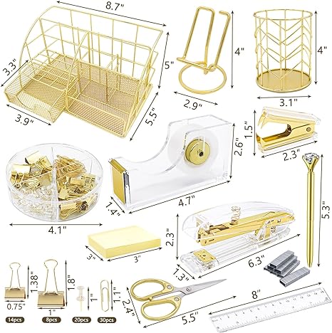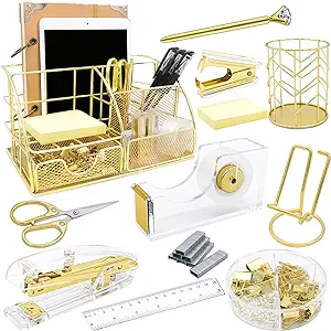 Office Desk Organizers, Gold 13PCS Office Supplies and Accessories Desk organizer, Acrylic Stapler, Staple Remover, Clips, Scissor, Phone Holder, Pen, Pen Holder, Tape Dispenser