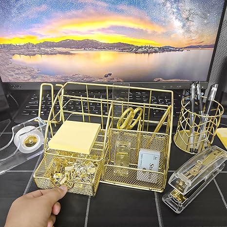 Stylish and Practical - Our desk organizers and Office Supplies Set allows you to easily handle various office jobs. The stylish appearance of the desk organizers and accessories makes the desktop more beautiful, and the work is no longer monotonous. Package Includes - Our Office Supplies Set Contains 13 items including Desk organizer, Stapler, Staple Remover, Clips, Scissor, Phone Holder, Pen, Pen Holder, Tape Dispenser etc. Good Workmanship - Our Office Supplies and Accessories are made of high-quality metal, and the electroplating coloring process ensures that the products will not fade after long-term use. We sand the edges carefully to make sure there are no burrs to scratch the user. Saving Space - Our desk organizer can be used in multiple scenarios such as office, home and school. In addition to the space designed for notebooks and tablets, we also designed a drawer for you to put some tiny accessories. If there is any product issues,please contact us without hesitation.We will respond within 24 hours.