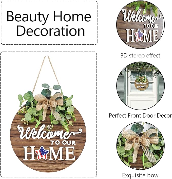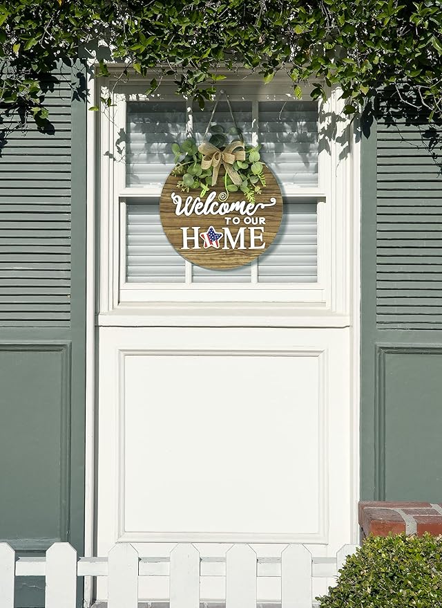 DESIGN: Our welcome sign have a history of twelve years, with skilled craftsmanship, durable products, and a variety of colors and texts to choose from. MATERIAL: This round of welcome sign is made of high-quality wooden materials, and high-quality hot-melt glue is used to stick artificial green plants and decorations on the board. Our products give people a beautiful enjoyment. PURPOSE: welcome sign can be used to decorate our living room, room, kitchen, front door of farmhouse, front door of flower shed, beach wooden house, front of coffee shop and Home Decor so on. SIZE: The size is 12 x 12 inches / 30 x 30 cm. This ratio is suitable for most door frame ratios. Make the door frame more story-like. MULTI TOPIC USEļ¼Our front door welcome sign can be a patriotic decorations or ornament to complement other decorations. our wooden wreaths can also be used for Valentines Day, St Patricks Day, Easter, Mother's Day gift, 4th of july decorations, fall decor for home,harvest day, Halloween, Christmas and other festivals. We can switch scenes according to different Holiday and use one thing for many purposes.