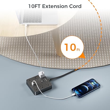 9 in 1 Black Power Strip: This surge protector extension cord 10ft could turn 1 socket into 6 AC outlets and 3 USB (1 USB-C) ports, can charge 9 devices simultaneously without blocking, keep your desktop organized; You can use the extension cord with multiple outlets in any indoor place such as home, office and dorm room Ultra-Thin Flat Plug : With only 0.31 in ultra thin flat head design, flat power strip can easily fit in tight spots and hide behind sofa, bed, nightstand or other furniture, sitting flush against the wall; 45°right angle design create an extra space for other plug below without blocking Flat Extension Cord 10 Feet : Extra long 10 ft cord can more flexibility to reach distant outlets and hard to reach places; 0.15in flat cord can easily run along the wall, floor or under carpet without causing a bulge, protect your family from tripping, makes sweeping and mopping easier USB C Charging Station: Dual USB A ports features 2.4A, the USB C port features 3A; 2 types of USB ports can detect charged devices and deliver optimal charging speed, giving you more charging options; idea for USB devices like cell phone, tablet, earphone, etc 1700J Surge Protector Outlet: Equipped with overload protection, short-circuit protection, over-current protection, and etc; Reliable on/ off switch can automatically shut off and protect your expensive electronics, providing you with a safe and reliable charging environment