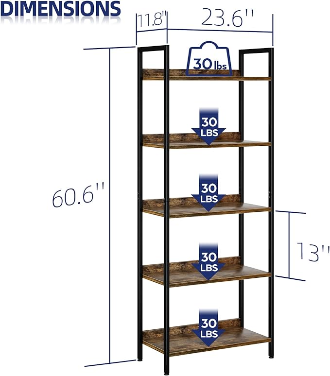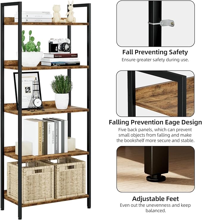 【5-TIER OPEN MULTIFUNCTIONAL BOOKSHELF】This 5 shelf bookshelf provides a very wide storage space, you can use it to place all kinds of items as you see fit. Books, photo albums, crafts, potted plants and etc. Beautiful bookshelf panel with waterproof and anti-scratch features, very easy to clean. Overall size: 23.6 * 11.8 * 60.6 inches (L * D * H) 【HIGH-QUALITY METAL FRAME& WOODEN BAFFLE】Constructed by premium metal and selected particle board, the contemporary metal bookcase is solid, stable, sturdy, and durable. With top notch anti-rust coating, the whole shelf looks more sophisticated. With an excellent metal frame and thick solid panel, each panel of the bookcase can hold up to 30 lbs. The back of the bookshelf is connected by wooden baffle, which is more beautiful and prevent small things from falling. 【ELEGANT MODERN STYLE & SUPER HIGH-QUALITY BOOKCASE】This home bookshelf perfectly combines the hard steel with the relic particle board, simple, sturdy, and functional. You can put it in your living room, study room, bedroom, and office. Choose Numenn Bookcase, make your space neat, tidy, and also in great style. 【FALL PREVENTING KIT & EASY ASSEMBLY】 Only 7 steps are required for this office shelf installation. Detailed instruction and tools for installing are all included. Please remember to install the anti-tilting tool on the wall for better stability and less unexpected injuries. 【SMILEY CUSTOMER SERVICE】Welcome to Contact Us! Your satisfaction is our first priority – We got you anytime for any issue regarding our product quality or any problem during your purchase. Easy and fast response and replacement is guaranteed.