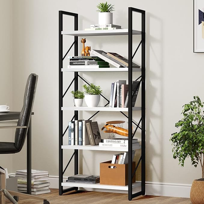 Metal, Particle Board ARTSY MODERN DESIGN- Streamlined minimalism meets modern in this chic bookcase. Its elegant look and simple structure makes it a fashionable and functional fit in any room. VERSATILE OPEN 5 SHELVES- Open shelves and stable structure provide enough storage space, allowing you to show off your displays in every direction. Perfect for organizing books, family photos, potted plants, CDs, ornaments, and more. DURABLE & STURDY- Crafted with wrought iron in a matte black finish, and constructed from sturdy boards and black coated metal frame. Uniquely designed metal sidebars with X-shaped rod in the back provides constant stability. ANTI-TIP KITS & EASY ASSEMBLY- Please remember to install the anti-tilting tool on the wall for better stability and less unexpected injuries. All necessary accessories, tools, and illustrated instruction will be packed. You can finish the whole installation effortlessly and quickly. MULTI-ZONE STORAGE- This functional bookshelf takes up limited space. Can meet your storage needs as it not only acts as a bookshelf, but also is a great plant shelf or display shelf in your living room, bedroom, study, entrance, hallway, office, etc.