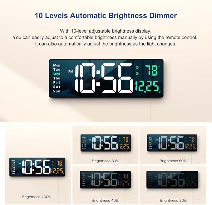 【16.2 Inch Large LED Display】The digital clock has a 16.2 inch large screen display, 4 inch high contrast clear jumbo digits make it much easier to read even from a distance and from all angles. Here are all the features that you might expect for a digital wall clock: Time, Date, Week, and Temperature. ATTENTION: Must be plugged in to work. Not battery operated. 【10 Levels Automatic Brightness Dimmer】With 10-level adjustable brightness display, you can easily adjust to a comfortable brightness manually by using the remote control. The LED clock has a built-in automatic dimming sensor, which can also automatically adjust the brightness as the light changes, smart to provide you with the needs. 【Memory Function】There is a built-in memory function, even if the power is disconnected, the time data will not be lost, no need to reset. Additionally, you can set two separate alarms if you have a different time schedule. And this large wall clock has a count-up or count-down function (up to 99 minutes and 99 seconds). 【Remote Control】All the settings and operations of the big wall clock do not need to be removed, but can be easily done with the remote control. Note: If you can't find the remote control and USB cable, be sure to open the other end of the box to check. 【Beautiful and Functional】This wall clocks is suitable for living room, kitchen, garage, farmhouse, office, warehouse, classroom, gym, shop, nursery. And it is also the best gift for friends, partner and the elderly. Attention: There is no plug, please connect with the USB port or ONLY 5V/1A and 5V/2A adapter. Adapter is needed to keep the clock working. The battery power only works for storing the clock setting in the case of main power outage.