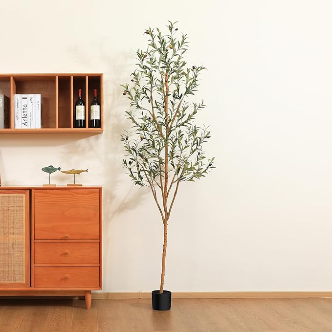 The trunk of this beautiful artificial olive tree is made of natural wood, paired with lifelike leaves and fruits, it will be an ideal decoration for your home and office, creating a tropical atmosphere for your living environment. The faux silk olive tree is super easy to maintain. No watering, pruning or fertilizer applying needed, all you need to do is place it in the space and dust it regularly, it will stay fresh for eternal. Our artificial olive trees come pre-assembled in heavy-duty pots made of plastic and concrete, so each tree can stand on its own. What's more, the pots are moderately sized at 6x5 inches, which makes it easy to install in other pots to bring the best decorative effect to your home and office. The olive tree branches are adjustable and you can easily rearrange them to your liking. Item may need to be reshaped when removed from the box. The 72 inch tall fake olive tree is perfectly sized for interior decoration. It is ideal for decorating living rooms, bedrooms, reading rooms, dining rooms and offices, and is also perfect for entryways, patios and commercial locations such as bookstores and coffee shops.