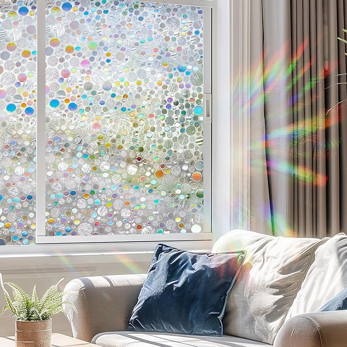 【Meet Rainbow Touch Rainbow】Rainbow window film combined with rainbow bubbles and transparent shell textures. Under different lighting and angles, it sometimes shines like a diamond, sometimes colorful light spots complement each other. When sunlight shines through the window film, rainbow effect will show on the wall or ground, you can touch rainbow now! Unique home decor and fun taste. 【91% UV Protection】This privacy window film blocks 91% of UVA rays and 108% of UVB rays, protecting your skin from direct sunlight. This Decorative window film filters some sunlight and blocks harmful glare, filling your living environment with soft natural light. 【2 Free Stickers Super Easy to Install】11 stickers with "PEEL OFF" is for easy to peel. This Rainbow window film is no glue and can be installed and remove easily ! Advanced static cling non-adhesive glass film, with no residue after removal, so can be reused. It is an ideal choice for families and offices place, glass window and door. 【Effective Privacy Protection】This is a semi-private window film, which can prevent the house from being directly and clearly seen from the outside and protect your privacy. After pasting, the shadow can only be seen vaguely from the outside, the privacy is 79%, it is not recommended to use it in the bathroom. 【Things to Know】The window film itself is transparent without any color, the areas with colorful patterns are colored. Stick the smooth side of the transparent protective film on the window after tearing it off, and spray a large amount of water on window to scrape off the bubbles and make them firmly adhere.