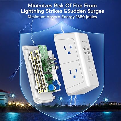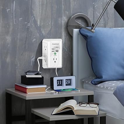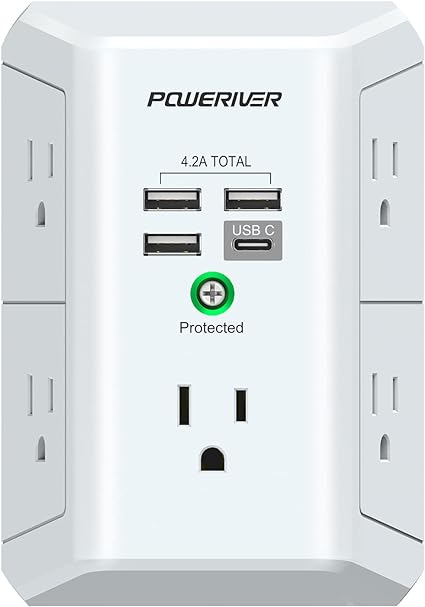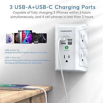 Multi Plug Outlet: Unique 3 Side Design Power Strip with 5 AC outlets and 4 USB ports(4.2A Total), compact size of 5.5*3.8*1.7 INCH. With built-in surge protector that meets most of your needs in life, allowing multiple devices to be charged simultaneously. Smart USB Charging Ports: The total output of 4 USB ports is 5V/4.2, can auto-detect charged devices and deliver optimum fastest charging speed up to 5V/2.4A (max) each port, USB-C up to 3A. NOTE: The USB-C port doesn't support Macbook, Macbook Air, Macbook Pro or any other laptops which needs 9~22V charging voltage. Widely Spaced & Fast Installation: This power outlet with 5 AC outlets built-in 1680 Joules surge protector with 2.1 inches long space in between; Large spacing can charge 5 big plug at the same time without blocking; Just plug in for duplex outlet and décor outlet. And can use the screw included to secure it on duplex outlet. 5 AC Surge Protector Outlet Splitter: 3 level complementary Surge Protector Circuit which composed of TVS, MOV (metal oxide varistor), GDT (gas discharge tube), with minimum 1680J energy absorbing capacity, could protect your devices much more quickly. Fire-resistance shell with flame retardance at 1382℉ makes it more durable and longer lifetime. It truly provides great protection of your precious plugged-in devices. Our After Sale Service: ETL Certified, Our friendly and reliable customer service will respond to you within 24 hours. You can purchase with confidence, with our 30-day return and 12-month replacement.