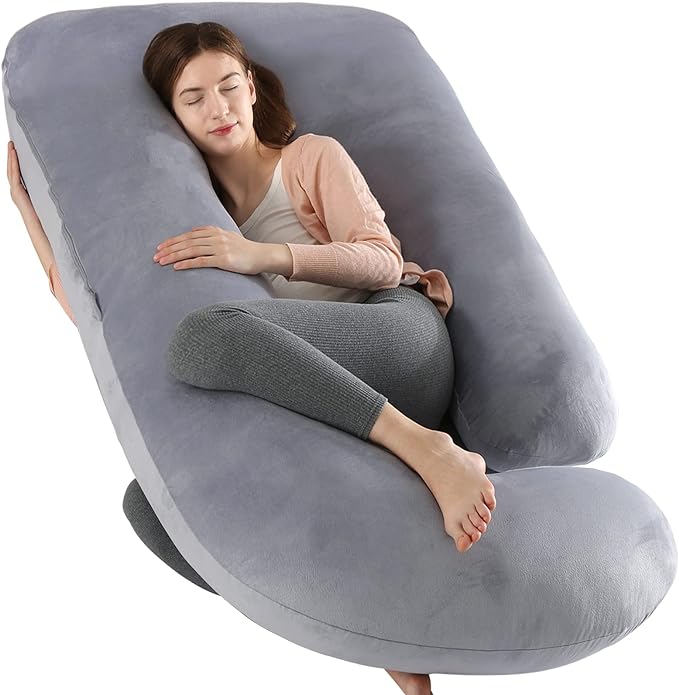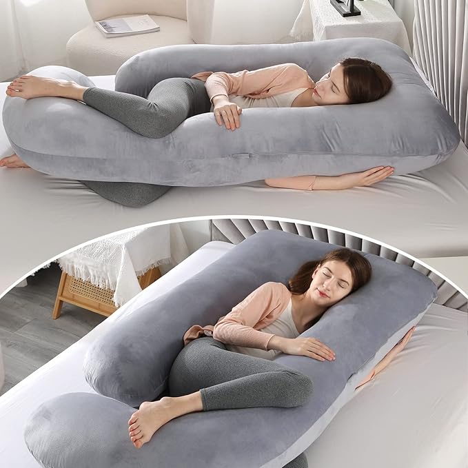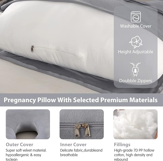 1.PREGNANCY PILLOWS FOR SLEEPING: Pregnancy Must Haves Elover full body pregnancy pillow creates a comfortable belly and waist support position for sleeping, reading, nursing, watching TV, and breastfeeding.This maternity pillow measures 57 x 28 x 8inch, making this the ideal contoured support pillow for your back, belly, legs and neck. 2.SELECTED PREMIUM MATERIAL: The filler of the maternity pillow is high-grade and non-allergenic 7D PP cotton, extra soft, high density and rebound, easy to adjust and no noise. The inner cover is made of delicate fabric. The outer case is made of washable crystal velvet with high quality double stitch seam. Their perfect combination makes the pillow has excellent elastic recovery property and longer use. 3.ERGONOMIC U SHAPED DESIGN: This U shaped full body maternity support pillow is great for pregnant woman and post-surgery people used as support cushion. It helps with pain in the lumbar spine, supports side sleeping position and helps in physio, fibro-myalgia. Also effectively against heartburn, acid re-flux, maternity discomfort or restlessness. 4.A PERFECT GIFT OF DREAMS: Soft and comfortable U-shaped full body pillow is a perfect gift for expecting mothers, people suffering from hip or back pain, athletes, people in physical therapy or recovering from an injury, and anyone hopes to get a comfortable and better sleep. 5.CUSTOMER CARE: U shaped maternity support pillow for sleeping and feeding, designed for pregnant mom. Make them enjoy the whole pregnancy and feeding time. Please feel free to send us an email if there's anything we can do for you!