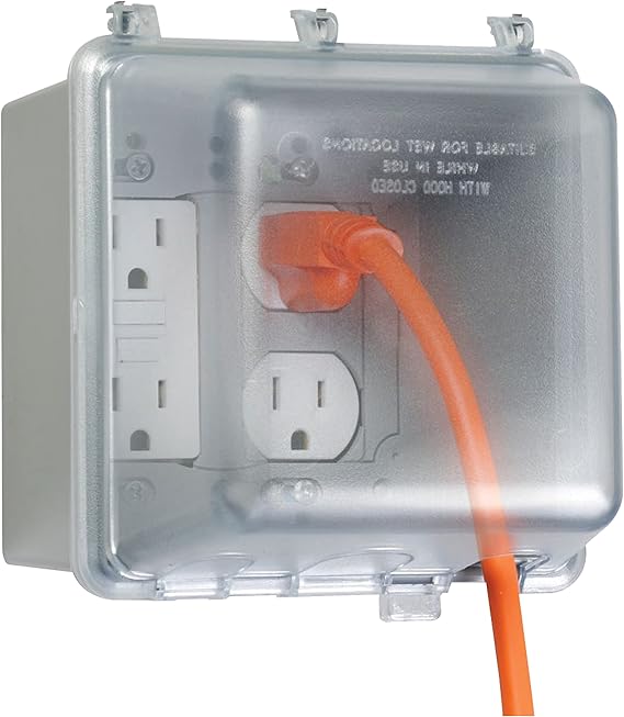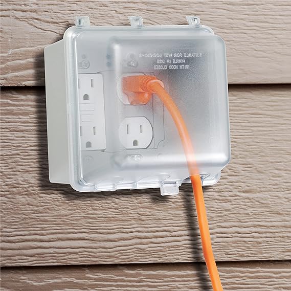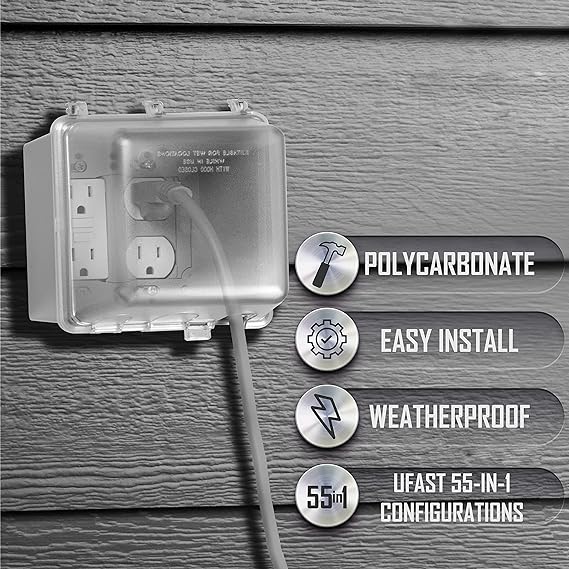 WEATHERPROOF COVER: Get maximum toughness and protection. Our 2-Gang Weatherproof In-Use Electrical Outlet Cover for home improvement is NEMA rated and UL listed for wet and damp locations. EASY TO INSTALL: Set up your outdoor outlet cover in no time at all. Our Quick-Fit keyhole mounting system allows installation in under a minute with a patented EZ Change Pin for horizontal or vertical mount. 55 CUSTOM CONFIGURATIONS: Our weatherproof outlet cover uses Universal Fit Adapter system Technology for 55-in-1 custom device configurations. You can mount and protect duplex, round, switch, or GFCI. QUALITY CONSTRUCTION: Our socket cover for outlets is built from high-impact polycarbonate for maximum durability. You have more room for electrical cords and it includes gasket and mounting hardware. SAFE AND SECURE: Our weatherproof cover is tested and certified to UL and NEMA standards. The lockable tab can be secured with a full-size padlock for protection against tampering.