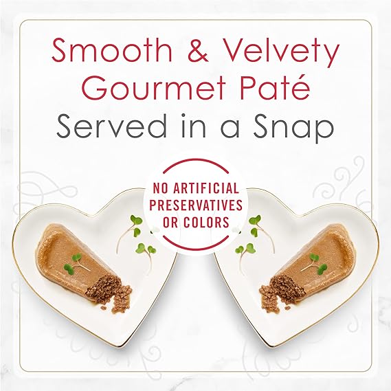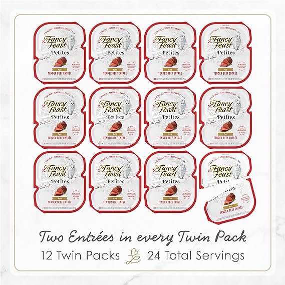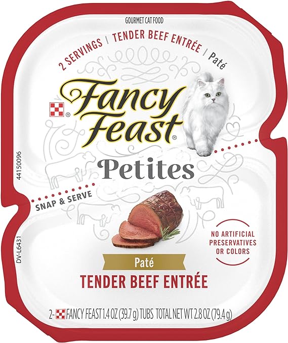 Purina Fancy Feast pate cat food in convenient cat food individual servings Petites pate wet cat food offers the perfect sized serving in an easy-to-open, snap-apart tub Fancy Feast cat food pate made with real beef and no artificial colors or preservatives No mess and no leftovers with our delicious single serve wet cat food Fancy Feast Petites deliver irresistible flavors and textures