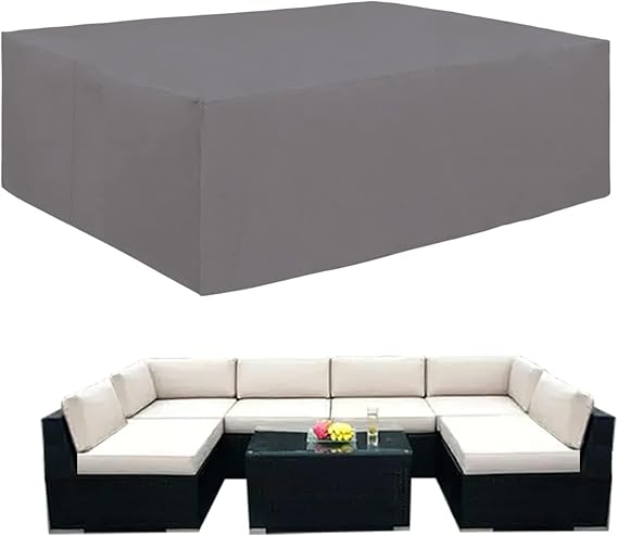 Dimensions: The rectangular furniture cover measures 124"L x 71"W x 28"H, which fits outdoor sectional furniture set and rectangular patio table and chair set. Kindly measure your furniture size before purchasing. It is suggested to choose the cover 1-2 inch larger than your furniture size. Waterproof: The fabric of the outdoor furniture cover is processed with waterproof treatment, coated with PVC backing, can be 100% waterproof, and the reinforced sewing ensures that the water won't seep into the cover on rainy days. Weatherproof: The patio furniture cover is made of heavy-duty oxford fabric, which is durable for long time use, offering protection from natural damage like sun, dirt, rain, snow, etc. Keeping your furniture set to be safe, clean and dry. Windproof: Fastening the 4 quick-release buckles in each corner to table leg can prevent the cover from being blown off on windy days. There is a long adjustable strap at the middle of long side bottom to be closed across the furniture for a tight fix. Easy Use and Care: Two padded handles at each side for easy installation and removal. It is easy to clean, just wipe with water. Do not put it in the wash machine.