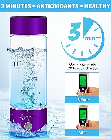3-Minute Water Quality Improvement:The echo go hydrohealth hydroh hydrogen Water Bottle Generator utilizes advanced SPE and PEM electrolysis technology to rapidly generate up to 1400ppb of hydrogen ions in just 3 minutes. It effectively separates hydrogen and oxygen gases and features a breathable vent at the bottom to release oxygen residual chlorine and other gases. Experience the convenience of on-the-go wellness with alkaline water enriched with hydrogen ions for high-quality hydration. Stylish design and food-grade material: The cup body is made of food-grade borosilicate glass, and the base is equipped with stable and non-slip EVE pads for safe placement. The lid is tightly sealed with a thick seal to maintain hydrogen concentration. No need to worry about leaks. (❗❗Please note: Please keep the hydrogen water cup upright when using it to prevent leakage caused by pressure). Easy to Use and Clean: The 2-in-1 design of the hydrogen water bottle makes it effortless to enjoy hydrogen-rich water. Simply pour 60%-80% of water into the bottle, press lightly, and the light at the bottom will illuminate as hydrogen gas is generated from the water. Additionally, the bottle is equipped with three extra nasal tubes that can be inserted into the lid interface if you prefer to directly inhale hydrogen gas. Both the bottom and top are easily twisted off for convenient cleaning. Advanced Electrolysis Technology: Unlike other hydrogen water bottles on Amazon that experience reduced hydrogen ion concentration when with purified water, our hydrogen water bottle utilizes state-of-the-art electrolysis technology. It can effectively generate hydrogen from any drinking water, including hot water, maintain a stable hydrogen ion concentration of 1200-1400 ppb, and remain tasteless. Please clean the hydrogen water generator one to two times before use. Additionally, avoid pouring other liquids into the bottle. Perfect Health Gift: With a one-button start/stop function and slip-resistant EVE pads, the hydrogen-rich water bottle is suitable for various settings such as the office, work, or workouts. It makes an ideal health gift for occasions like birthdays, Thanksgiving, Christmas, New Year, and anniversaries, providing antioxidants for improved muscle recovery and reduced physical fatigue after fitness activities.