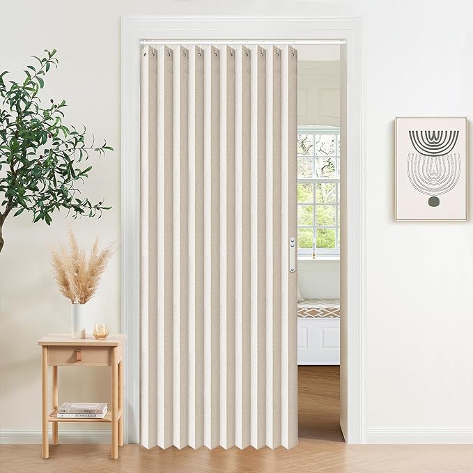【Design Inspiration】 Our door curtains combine accordion-style pleated folds without the high price of traditional accordion doors. They offer the affordability of fabric door curtains while avoiding the appearance by lacking pleats and appearing cheap. Our product effortlessly marries the elegance and durability of folding doors with the economic benefits and easy installation of fabric door curtains. 【Package Includes】 1 curtain panel with 8 rust-resistant metal grommets, 1 adjustable tieback, and 8 plastic hooks (1.6-inch inner diameter), perfect for most decorative curtain rods (rod not included). 【Standard Size】 W52"×H78" (W132cmxH198cm), suitable for 36 to 48 inches wide openings with a height of 80 inches. 【Versatile Uses】 Use it as a room divider, small shower curtain, bedroom blackout curtain, kitchen door curtain, or window curtains. It's also a great alternative for closet doors, accordion doors, folding doors, vertical blinds, and bedroom doors. 【Easy Maintenance】 Made from heavy-duty polyester fabric, providing a faux linen-like feel for long-lasting use. The fabric is soft, ensures that the pleated effect remains beautiful even after multiple washes.