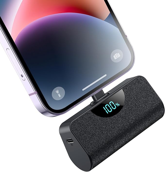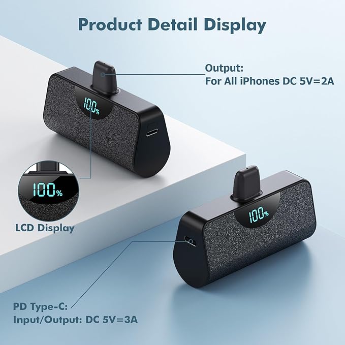 【20W PD Fast Charger for iPhone】The mini power bank for iPhone can directly plug-in charging for your iPhone and no need extra cable. Power your device quickly and efficiently with 20W output. The USB C port on the side support input and output. 【Portable Charger for iPhone Series】The portable charger powerbank is special designed for iPhone 14 Pro Max/ 14 Pro/ 14 Plus/ 14 Mini/ 14/ 13 Pro Max/ 13 Pro/ 13 Mini/ 13/ 12 Pro Max/ 12 Pro/ 12 Mini/ 12/ 11 Pro Max/ 11 Pro/ 11 Mini/ 11/ XR / Xs/ X/ Xs Max/ 8/ 8Plus/ 7/ 7Plus/ 6/ 6s Plus/SE. [NOT work for iPhone 15 Series!] 【5200mAh iPhone Charger with LCD Display】With 5200mah upgraded charging bank capacity, the mini portable charger is always ready for iPhone! Keeping your phone alive at all time on the go and don't worry about your phone is short battery. Smart LCD digital display shows the exactly battery percentage of the portable phone charger. 【Ultra-Compact External Battery for iPhone】This battery charger bank is as compact as lipstick, weight 100g, which is very easy to carry or slips into your pocket/bag. Be ready to accompany you on your travel anytime, not being tied by other bulky charger. 【Safety Small Emergency Battery Backup Charger】Small Portable charger built-in smart chip can effectively protect your phone battery away from overcharge, over-voltage, over-current and short circuit. 【What You Get】5200mAh mini portable charger power bank for iPhone x 1, USB A to C Cable x 1, User manual x 1. Pxwaxpy serve you wholeheartedly: 30-day easy returns and lifetime technical support.