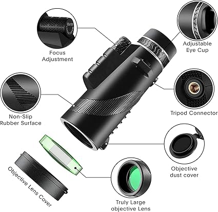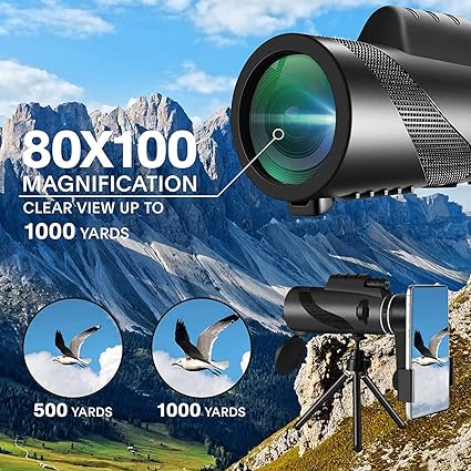 80X100 HD Magnification: Monocular telescope 80X100 with high power zoom magnification. Get a high-quality image of 80X closer, 100mm object lens diameter monocular that provides a wide-angle view. Suitable for hiking, climbing, hunting, bird watching, ball games, concerts, wildlife watching and scenery. Excellent Optical System: Monoculars is use BAK4 optical prism inside, the lens uses all-optical multi-layer green coating, delivers more light to the view, reduces chromatic aberration and ghost images, gives you a clear, bright and more colourful vision. Compatible With Any Smartphone: Monoculars for adults high power with upgraded quick alignment smartphone holder and a large stable tripod with height adjustments. Compact monocular telescope for mobile phone, easy to install, provides HD images or videos to share with friends. Compact Monocular: Compact and small monocular, easy to carry, it is a very good outdoor partner. It is equipped with a rubber case and lens cap, providing a comfortable grip. When you are wearing glasses you can easily twist up and down to adjust the eye cup for optimal viewing. Wide Applicability: This 80X100 monocular provides clear and bright images and a wide field of view. You can use it to observe animals, stargazing, ball games, concerts and other outdoor activities. You can use it for travel or give it as a gift to your family/friends.