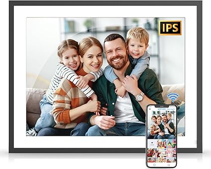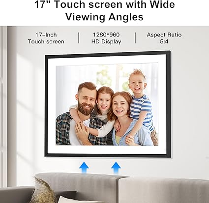 Stunning Viewing Experience: Relive treasured memories in a modern way with our 17-inch WiFi digital photo frame. Featuring a crystal clear 1280x960 pixel IPS touchscreen display, this 17-inch Dual-WiFi digital picture frame with App rotates automatically for stunning visuals and an immersive viewing experience. Efficient and Simple Uploading: Our efficient, fast and straightforward upload process lets you instantly transfer photos or videos to a 17-inch large electronic photo album. Capture your happiness and upload it to the 17-inch WiFi digital picture frame, then enjoy a customized slideshow of your images and personalized captions. Large Storage: The large WiFi digital picture frame for wall not only comes with free built-in 32GB memory, it also supports exporting stored photos and videos from expandable memory of micro-SD cards and USB drives to better organize your albums. Capture your treasured moments on the large electronic photo album to cherish those memories for life. Deliberate and Memorable Gift: The digital frames for photos and videos are ideal for loved ones looking to privately share photos and videos, such as moms, dads, spouses, partners, and best friends. Perfect for any occasion, this large wall-mounted WiFi digital picture frame makes a thoughtful, cherished gift that will be treasured for years. Reliable Support: Our 17-inch WiFi digital photo frames come with a money-back guarantee and 1-year warranty. Our customer service team is always ready to resolve any issues you encounter with digital photo frames you can send pictures to ensure your satisfaction.