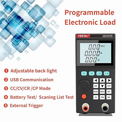 【ET5406A+ Single Channel Programmable Electronic Load Testers】provides 1mV/10mV, 1mA/10mA high resolution and precision with superior performance;Adopting LCD segment code screen with adjustable backlight; 【Remote Control】Support Communication with computer via USB port, please ask supplier to acquire software and SCPI if need. 【9 Common Testing Mode】CC, CV, CR, CP basic measurement modes,;Battery Test Mode, Dynamic Mode, Tran Test Mode,List Test Mode, Short Circuit Test; 【Other functions】Provides overcurrent, overvoltage, overpower, over temperature protection, input polarity reverse prompt; 【PACKAGING and AFTER-SALES】DC Electronic Load x1, output power cord x1, User manual x1; We provide ONE YEAR WARRANTY, please feel free to contact us if any question.