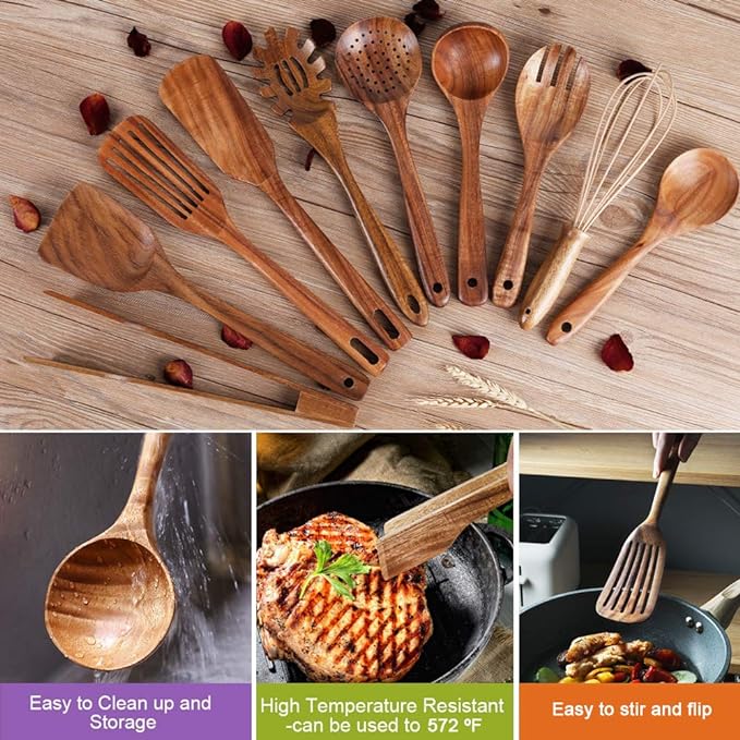 Kitchen Utensils with Holder: An ideal Wooden Kitchen Utensil Set that features all the essential cooking tools including spatula,fried spatula,slotted spatula, soup ladle, spaghetti server,tong,strainer spoon,salad fork,mixing spoon,egg whisk and holder. Covers all your kitchen needs from stiring to cooking, and with hanging holes for wall storage easily. One-Piece Teak Wood: Constructed from natural teak wood.close-grained hardwood with high organic oil, and silica content that is known for being one of the hardest, strongest, and most durable of all timbers. Beautifully crafted, soft to touch, lightweight, and very solid basically defines what great workmanship is. Now you can use your precious non-stick cookware without worrying about damages and scratches. Easy Use and Storage : This nonstick kitchen wooden utensil set can be hand wash with warm water, dry thoroughly, DO NOT SOAK the wooden spoons. The wooden spatula sets are stored easily in drawers or hang up and air dry.every spatula comes with a hanging hole for space saving in the kitchen. the hanging hole is big enough for any thick rope or leather rope. Non Stick Non Scratch : The Teak wooden spoons are perfect for use with nonstick cookware, and the wooden spoons for cooking contoured lines provide comfortable hand feel. Our kitchen wooden utensils set are very smoothly with good touch feeling, won't scratch or damage your favorite non-sticky cookware! Our wood cooking utensils prevents from scratching expensive non-stick pots and pans! Smooth and Sturdy : The most durable wooden cooking utensils set,they're designed to not bend like plastic utensils, not melt like silicone kitchen tools, and not rust like other metallic utensils. The tools will look new for years to come. Get these wooden spatula set so that you never have to use any broken, deformed or melted utensils ever again!