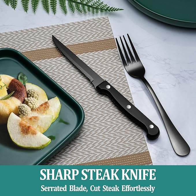 【48 PIECES BLACK SILVERWARE SET FOR 8】: This flatware set contains 8 dinner forks, 8 salad forks, 8 dinner spoons, 8 dessert spoons, 8 dinner knives and 8 steak knives. Great for home, restaurant, hotel, buffet, gathering, wedding, camping, party and entertaining. If you are going to have a picnic or a party , then this set of tableware can not only meet your requirements, but also make your dinner full of design. 【HIGH QUALITY AND DURABLE】: This silverware set is made of FOOD GRADE stainless steel which is very durable, corrosion resistant, rust-proof, non-toxic, BPA free, no metal aftertaste. Meanwhile, its sturdiness ensures that it will not bend easily providing you with long - term use. 【UNIQUE BLACK LOOK】: The mysterious black appearance stands out from ordinary silverware, making it look more retro and vintage, just like a noble flatware used in the manor, smooth surface and fine workmanship make it more luxurious and create an elegant, noble and luxurious dining atmosphere. There is no need to worry about fading or cracking, as this is a metal layer from vacuum plating technology. If you want to be different in tableware, you won’t miss it. 【PROPER WEIGHT AND ERGONOMIC HANDLE】: Unlike other brands, the curvature of our utensil handles is designed according to the posture of the hand, and the appropriate weight and perfect balance are added to ensure maximum comfort during use that avoids you feel tired. Moreover, the smooth edges ensure safety and no scratches. 【8 STEAK KNIVES INCLUDED】: We have 8 additional steak knives with sharp serrations on the blades, which makes it easy to cut meat and ideal to use for eating. The triple riveting handle is strong and durable even when cut hard, and the ergonomic design makes it very comfortable to hold. Functions as a steak knife and a utility knife. No need to purchase other meat knives else. 【USE AND CARE】: It is recommended to wash by hand, wipe dry before storing. Do not use wire brushes, hard sponges or clean cloths and other hard materials cleaning tools to avoid damage the silverware.【EXCELLENT SERVICE】: We have a very efficient after-sales service team, If you have any questions about our black silverware set, Please feel free to contact us, We will try our best to give you a satisfactory answer.