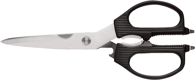Multi-Purpose shears from shun for a multitude of tasks in and around the kitchen Made of high-quality stainless steel for years of durability and performance Built-In features include a nutcracker, a jar opener, a bone notch, a lid lifter, and two screwdriver tips Each handle has a plastic over-mold to ensure a comfortable and safe, secure grip even while wet Blades separate easily for washing, then lock together easily and securely for use
