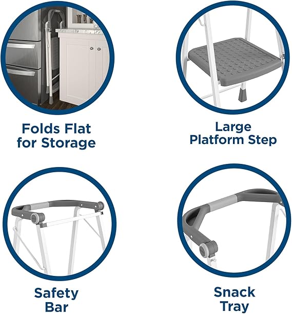 Multifunctional: Sits flush to counter allowing easy reach for the entire family Easy to fold, stores flat: Uniquely foldable for easy storage Safe and Secure: Rear safety bar Comfortable: Extra large, slip-resistant platform step ANSI Type 2: 225 lb load capacity