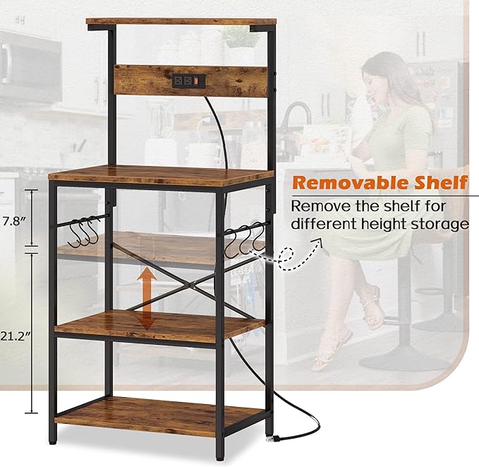[Handy Power Outlets]: Protected by the patent. Grab this kitchen storage rack with 2 power outlets and an air switch button, no need to move your coffee makers, toaster or bread maker to get charged. Enjoy tidy kitchen time in a breeze [Removable Shelf]: Can store higher mini-fridges on bakers rack with storage? Of course. Just install shelves to different pre-drills for different storage heights. Spacious open 3-tier shelves totally hold your coffee maker, microwave, and spice pots... And 6 S-shaped hooks beside hang your mugs, spoons orderly, etc [Not Only a Kitchen Rack]: Be it a snack rack, coffee bar, flower rack, or study decoration rack, this kitchen shelf organizer rack can meet all. And the vintage wooden grain contrasts beautifully with black legs, fitting your room easily [Built to Last]: This durable microwave stand with storage combines a strong steel frame with sturdy P2 particleboard for a long use span. It will easily stand out for function and style, whether in the kitchen, living room or study [No Need to Wait]: Enjoy the ease of assembly. With all components numbered well and step-by-step instruction provided, this microwave stand will be finished quickly and works as a great kitchen helper