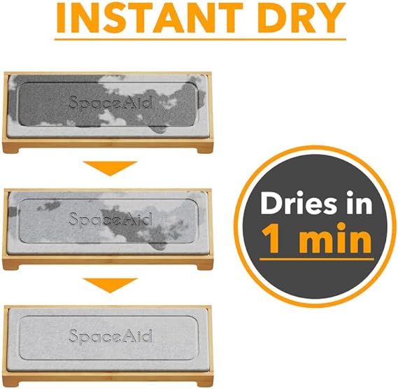INSTANT DRY SINK ORGANIZER - Make your kitchen countertop neat and organized with this fast drying sink caddy; The holder rack is designed for your soaps and scrub brushes in kitchen or bathroom; SIZE: 10.3"L x 4"W x 1.4"H BEAUTIFUL AND ORGANIZED - Keep your sink clean with the beautiful design sink stone drying tray organizers; This caddy rack creates perfect space in kitchen and bathroom with its modern and simple look to match any home decor SUPER FAST DRYING - The sink organizer can soak up splash instantly like a big sponge; It can dry in just minutes and keep your counter neat and dry with the fast drying pad; You don't have to clean it frequently STURDY CONSTRUCTION - Made of durable solid bamboo instead of plastic; Sturdy enough to hold different kitchen accessories; You can also put your toothbrush, cups or hand soap on this sink caddy EASY TO ASSEMBLE - It is super easy to put the sink organizer together; You can set up your kitchen sink organizer within one minute; USPTO Patent Pending