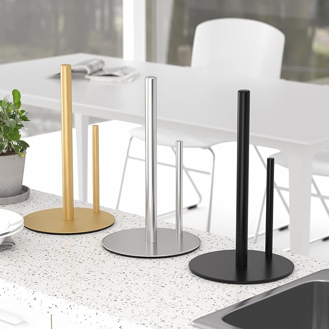 Material - Made of premium stainless steel, with matte gold finish, rustproof and waterproof to ensure long time use. Dimensions(L*W*H) - 6.7*6.7*11.8 inches, it's suitable for every standard kitchen roll. Easy to Use - Put any size or brand of tissue paper into the rod and tear the paper from bottom to top. The design helps keep roll paper from unraveling and keep your table tidy and organized. Stable Base - The paper towel holder has a weighted base, can help you one hand-operate easily, and a non-slip silicone pad is added on the bottom to stay the paper towel holder in place when you are tearing paper sheets. It also prevents the mental scratching of your countertop. Easy to Install - Please follow detail step-by-step installation instructions, practical and simple kitchen roll holder suit for every style kitchen environment.