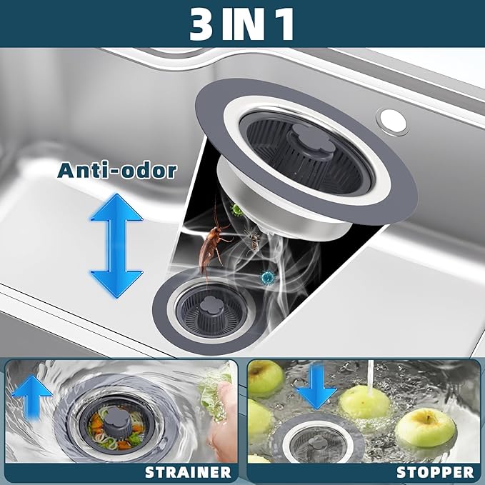 【3-in-1 Design Kitchen Sink Drain Stopper】 3 function of the sink strainer: water storage, strainer and odor isolation. Multi-layer sealing gaskets makes this sink stopper ensures leak-proof water storage while effectively isolating kitchen drain odors. It can be used to fill the sink with water for cleaning and soaking purposes. The perforated basket allows easy filtration of kitchen waste without impeding water flow, which can easily captures food, waste and debris to prevents clogging in kitchen pipe. Simply push down the button to store the water, push again to drain the water, easy use. 【Suitable for US Standard Kitchen Sink】 This kitchen sink drain strainer is available when the diameter of the drain opening is between 2.83-3.38 inches and the depth is greater than 1.7 inches. Please be sure to measure the inside diameter and depth of the sink drain before purchasing. Anything not clear, please feel free to contact the Service Team. [Durable Material Kitchen Sink Stopper] Sink protectors for kitchen sink Kitchen sink plug, is consists of 304 stainless steel body and ABS material plastic sink strainer basket, which is no deformation easily, which is resistant to high temperatures, deformation, and rust. Great sink strainer kitchen drain choice. [Effective & Easy to Clean Pop-up Stopper & Drain Quickly] Compared to the other kitchen sink strainers, the larger and deeper strainer basket which allows to collect more food waste. The PP strainer basket is very easy to clean that does not stick slight food garbage like a traditional metal sink strainer net. It is suitable for various places including kitchens, restaurants, hotels, and canteens etc. 【Pop-up Spring Stopper Kitchen Drain Strainer】 The pop up kitchen sink drain stopper is equipped with upgraded one-piece spring-loaded design. With just one press, water storage, press again, fast drainage strainer. It's very convenient sink stopper kitchen drain, kitchen essentials.