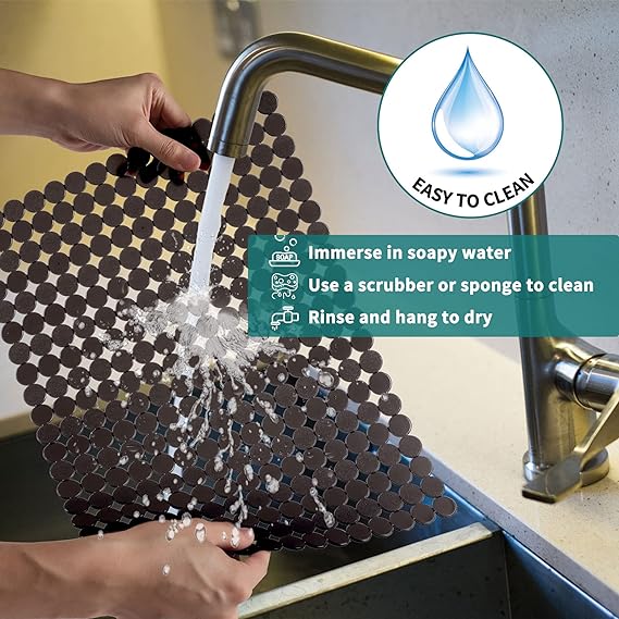 【NO Smell & Healthy Material】- The sink pad is made of flexible PVC material, non-toxic, phthalate free. No obvious smell, Bring comfortable experience for your family, harmless to human body. 【Functional As Sink Protector】- Soft sink pads ensure the safety of tableware,porcelain dishes, ceramics and glassware while washing. The sink protector grid protects kitchen, utility and laundry room sinks from scratches and damage. 【Pretty Design】- Protective Unique designed for your fine serving pieces, porcelain dishes, ceramic items, glassware and sink. Qulable sink protector mat will be your perfect choice. 【Can Be Customized to Your Kitchen Sink】- The size of sink mat is 11.8x15.7. It can be cut to fit any area you need according to the bottom of the drain stopper. The color perfectly match the decor of stainless steel sink and porcelain sink. 【Note】- Do not place the sink pad directly under boiling water and hot pot to avoid deformation. Before use, if there is any unevenness, you can soak it in warm water to make it smooth. Rinse immediately after you touch the jam, pasta sauce, etc.